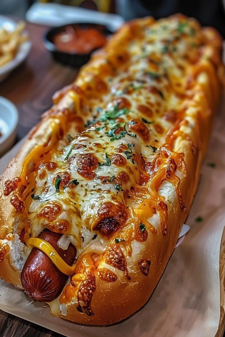 This cheesy gourmet baked hot dog baguette takes the classic stadium snack and transforms it into a premium, oven-baked masterpiece.