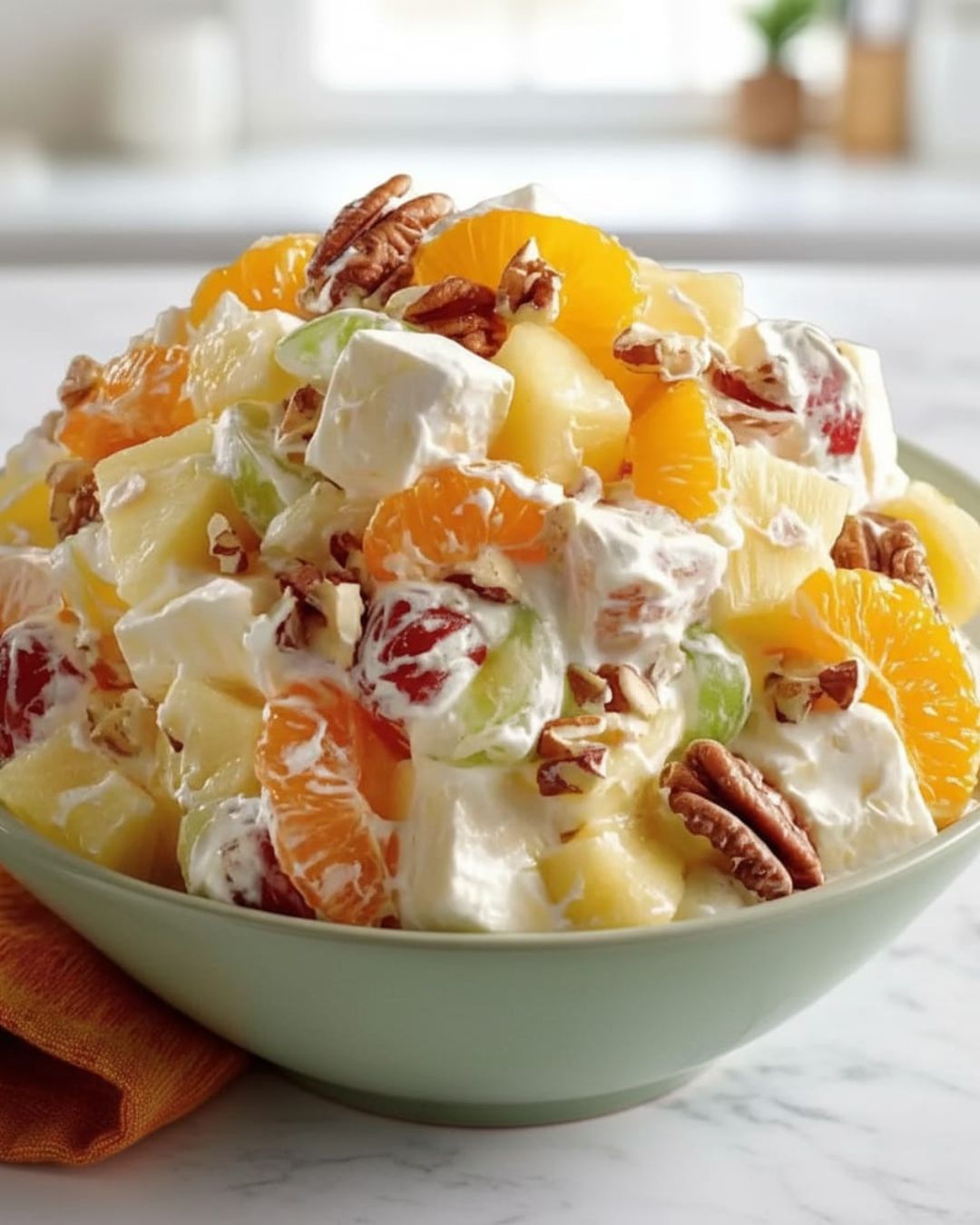 has been my go-to potluck superstar since that scorching summer BBQ last year when my traditional pasta salad literally melted. There’s something magical about how the juicy mandarins and crisp apple chunks dance with coconut cream (way better than the heavy stuff my grandma used, bless her heart). I probably make this twice a month now — it’s stupidly easy and everyone always asks for the recipe. The secret? Fresh fruit only, none of that canned business. And honestly? It tastes like summer vacation in a bowl.