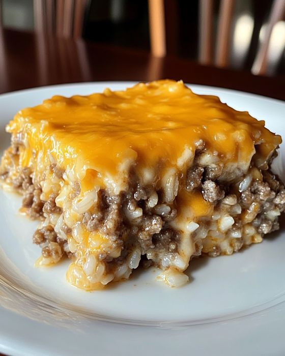 This Cheddar Crusted Ground Beef and Rice Casserole is a classic one-pan meal that is hearty, comforting, and simple to make. Uncooked rice absorbs the rich flavors of beef broth, cream of mushroom soup, and savory ground beef as it bakes, resulting in a tender, flavorful casserole topped with a melted, golden-brown crust of Cheddar cheese.